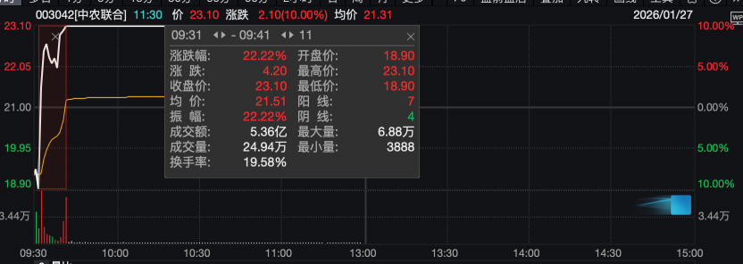 白银有色昨晚发布股票交易风险提示公告称,公司股票于2026年1月20日、1月21日、1月22日、1月23日、1月26日连续五个交易日内收盘价格涨幅累计达61.16%,涨幅显著,公司基本面未发生重大变化,可能存在市场情绪过热的情形,交易风险大幅提升,存在股价下跌的风险,请投资者注意投资风险。 白银有色称,截至2026年1月26日,公司属于中上协行业分类中的有色金属冶炼和压延加工业,公司与同行业88家上市公司市盈率进行比较,剔除14家静态市盈率为负值的上市公司,同行业平均静态市盈率为125.42倍,白银有色静态市盈率为1045.76倍,处于较高水平;剔除15家动态市盈率为负值的上市公司,同行业平均动态市盈率为112.68倍,白银有色动态市盈率为477.66倍,处于较高水平,请投资者注意投资风险。 中国黄金昨晚发布股票交易异常波动公告称,公司股票于2026年1月23日、1月26日连续两个交易日内日收盘价格涨幅偏离值累计超过20%,股价剔除大盘和板块整体因素后的实际波动幅度较大,属于《上海证券交易所交易规则》规定的股票交易异常波动情形。 另外,中国黄金称,2026年1月23日、1月26日两个交易日公司股票的换手率分别为8.70%、9.37%,高于日常换手率,敬请广大投资者注意投资风险。 又见个股“地天板” 异动个股方面,中农联合(003042)盘中上演“地天板”。具体来看,今日,中农联合大幅低开,随后迅速走低触及跌停,9:31后,公司股价大幅拉升走高,在11分钟内涨停,上演“地天板”。Wind数据显示,中农联合半日成交额达6.6亿元,已超昨日全天。