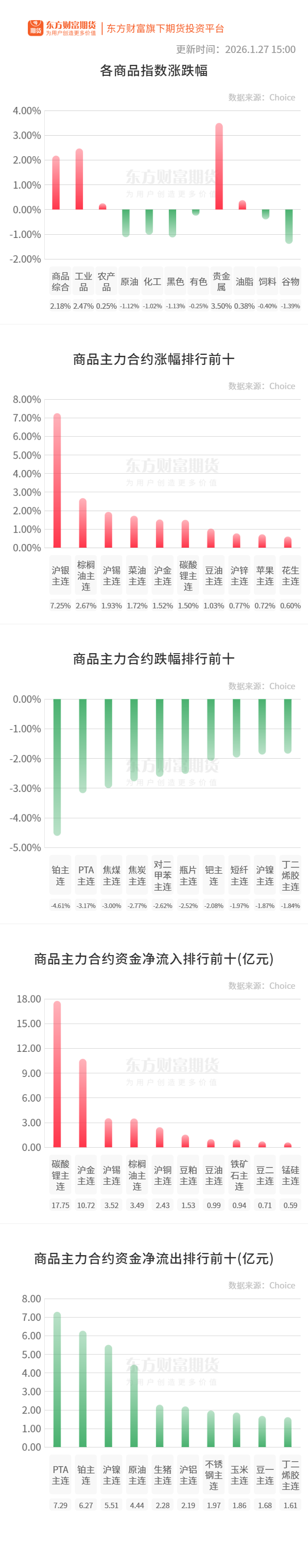 行情纵览![]() 宏观产经国家统计局:2025年,全国规模以上工业企业实现利润总额73982.0亿元,比上年增长0.6%。2025年,规模以上工业企业中,国有控股企业实现利润总额20561.0亿元,比上年下降3.9%;股份制企业实现利润总额55408.3亿元,下降0.1%;外商及港澳台投资企业实现利润总额17447.4亿元,增长4.2%;私营企业实现利润总额22810.6亿元,与上年持平。 新华社:记者1月27日从人力资源社会保障部获悉,我国将实施稳岗扩容提质行动,推出重点行业就业支持举措,出台应对人工智能影响促就业文件。强化重点群体就业支持,印发高校毕业生等青年就业文件,出台统筹城乡就业体系意见,建立常态化防止返贫致贫就业帮扶机制。 品种资讯黑色系期货 不锈钢:1月26日晚间,佛山诚德冷轧不锈钢产线全部停机,预计开机时间在3月初。受此影响,3月之前钢厂无新货,春节前将以出库存为主。主要影响201为主,月产均量约4~5万吨左右。(Mysteel) 铁矿石:卫星数据显示,2026年1月19日-1月25日期间,澳大利亚、巴西七个主要港口铁矿石库存总量1168.9万吨,环比下降4.7万吨,小幅回落。目前库存量略低于年初以来的平均水平。(Mysteel) 农产品期货 棉花:最近,国内期货价格明显走高。从去年11月初到现在,主力合约每吨涨了接近1100元,涨幅超过7%。今年1月初,价格一度冲到每吨15000元,创下近一年半来的新高。期货涨,现货也跟着涨,全国棉花平均现货价每吨涨了1000元左右,涨幅接近7%。业内人士认为,本轮棉花期货上涨,是供需、成本和市场预期等多重因素叠加共振的结果。同时,市场对下年度种植面积缩减的预期等其他因素,也增强了市场对后市的看多情绪。(央视财经) 生猪:据农业农村部监测,截至1月27日14:00时,全国农产品批发市场猪肉平均价格为18.66元/公斤,较前一日上升0.1%;鸡蛋平均价格为8.51元/公斤,较前一日上升1.2%。(新华财经) 据农业农村部监测,2026年1月5-11日,生猪定点屠宰企业生猪平均收购价格为13.71元/公斤,环比上涨1.1%,同比下降21.7%。白条肉平均出厂价格为17.81元/公斤,环比上涨1.1%,同比下降22.0%。(新华财经) 豆粕:截止到2026年第4周末,国内豆粕库存量为90.68万吨,较上周的94.80万吨减少4.12万吨,环比下降4.35%。其中:沿海库存量为75.11万吨,较上周的80.75万吨减少5.64万吨,环比下降6.98%。(中国粮油商务网) 有色/贵金属期货 碳酸锂:2025年,青海全年生产钾肥757.5万吨、增长1.1%,生产碳酸锂16.9万吨、增长25.3%,持续为保障国家粮食安全和新能源产业链供应链安全稳定作出青海贡献。(上海证券报·中国证券网) 工业硅:华东不通氧553#在9100-9300元/吨;通氧553#在9200-9300元/吨;521#在9300-9500元/吨;441#在9400-9600元/吨;421#在9500-9800元/吨;421#有机硅用在9800-10200元/吨;3303#在10200-10500元/吨。黄埔港、天津、西北地区个别硅价也有上调。昆明、上海、新疆、四川地区硅价持稳。97硅今日价格持稳。(SMM) 沪银:摩根大通前首席策略师、全球研究联席主管MarkoKolanovic表示,2026年晚些时候,白银价格或跌至当前水平的约一半。(财联社) 能化期货 纯碱:近期湖南金富源碱业装置恢复,河南骏化、天津碱厂纯碱装置减量,行业整体开工维持中高水平,市场货源供应量充足,部分厂家出货压力犹存。盘面价格震荡运行,下游用户谨慎适量备货,华东地区部分厂家新单报价探涨20—30元/吨,华中、西北、西南等区域纯碱厂家新单价格变动不大,短期国内纯碱现货市场或延续窄幅整理态势。(卓创资讯) 原油:当地时间1月26日,记者获悉,墨西哥国家石油公司(Pemex)暂停了向古巴运送原油的计划。(央视新闻) 晚间关注无 (文章来源:东方财富研究中心) |