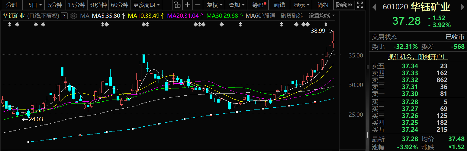 1月27日,华钰矿业股价出现下跌,截至27日收盘,华钰矿业跌3.92%,报37.28元/股。